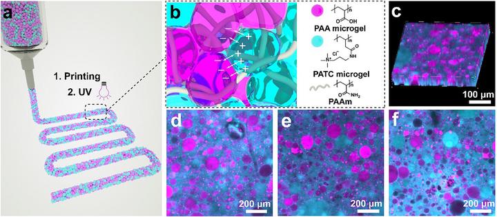 Rapid advances in biomedical applications and soft robotics demand load-bearing soft materials that can be processed into complex 3D shapes. Direct ink writing (DIW) enables the fabrication of customizable shapes with locally varying compositions. Hydrogels that are formulated as microgels meet the rheological requirements that DIW imparts on the inks if they are jammed. However, most granular hydrogels are soft because inter-particle interactions are weak. These hydrogels can be reinforced with a second hydrogel, yielding double network granular hydrogels (DNGHs). Yet, DNGHs suffer from low fracture energy. This limitation is addressed by electrostatically reinforcing them. The resulting materials exhibit Young’s moduli and fracture energies similar to values of cartilage and muscles. An empirical model is proposed to predict the fracture energy of these reinforced DNGHs, based on the dissipation zone size, contact area, and adhesion energy. These DNGHs can be 3D-N, N-methylene bisacrylamideprinted into free-standing structures exhibiting tuneable mechanical properties at the centimeter scale without the need for supporting structures.